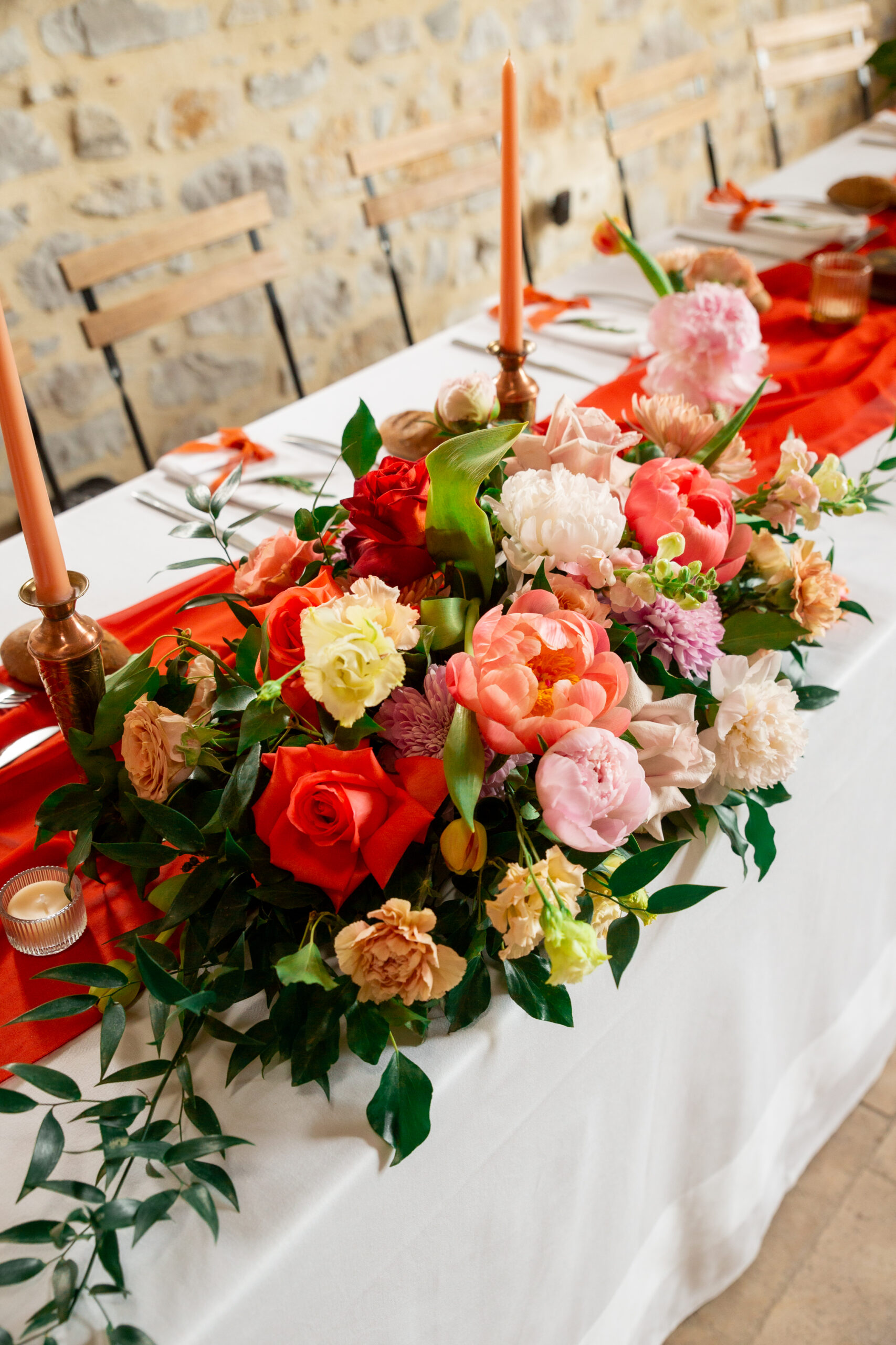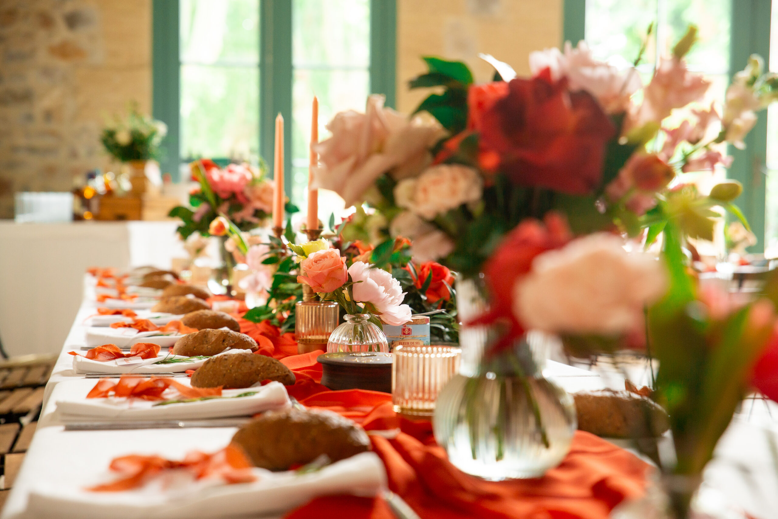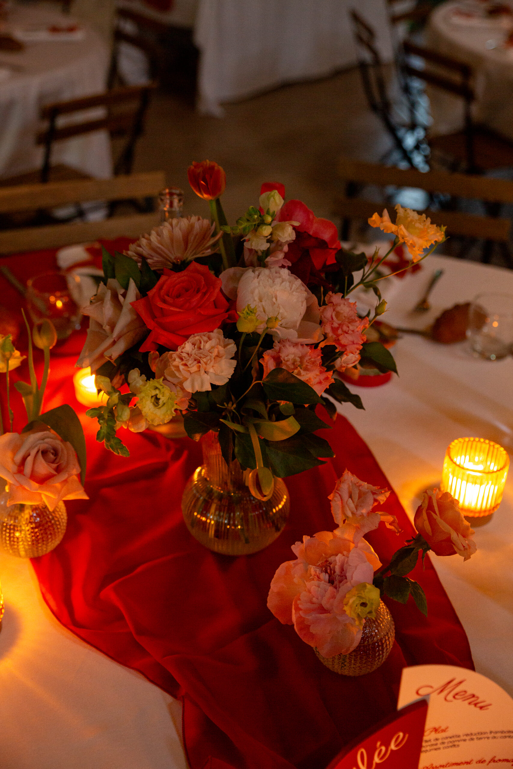 Sur les tables : Des bouquets travaillés en trio avec jeu de volumes et hauteurs, et une composition centrale plus importante pour la table d’honneur qui était allongée.