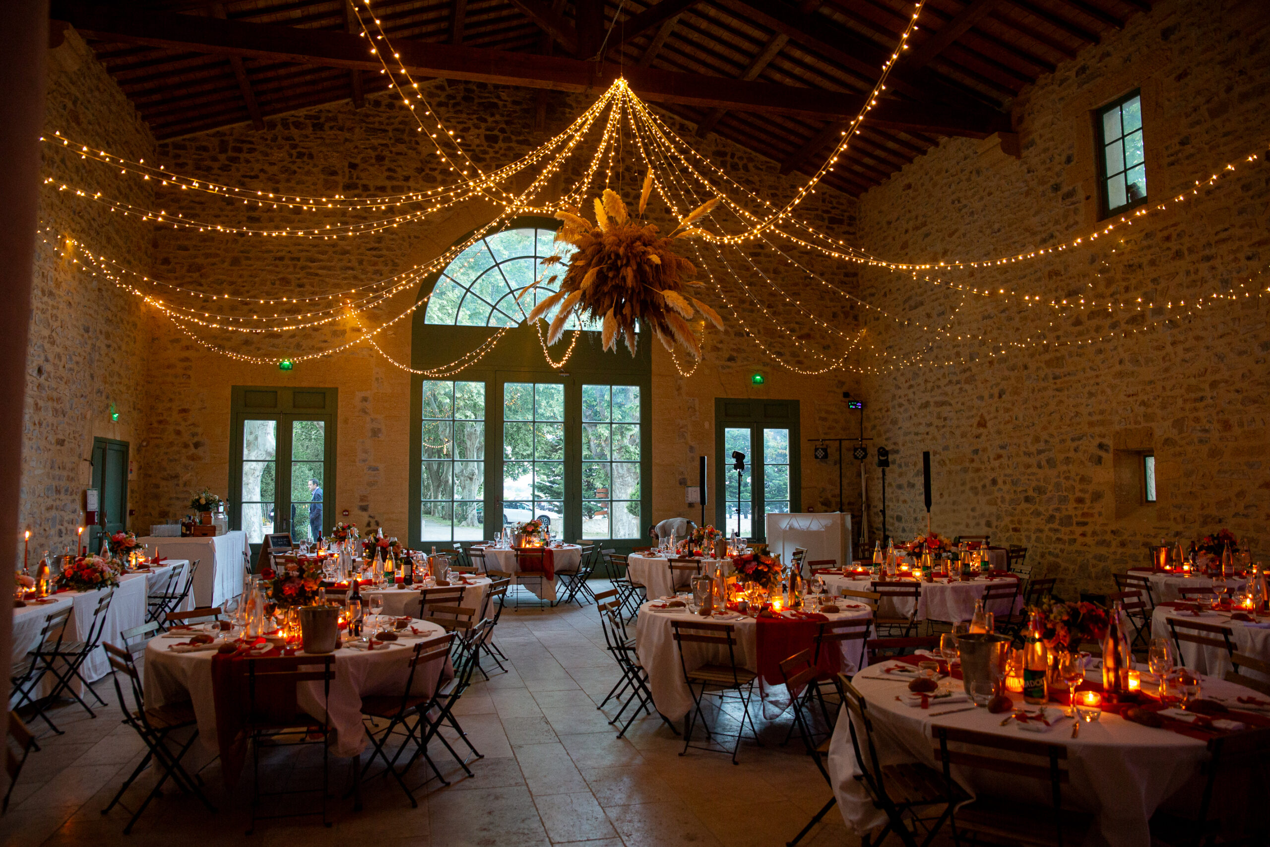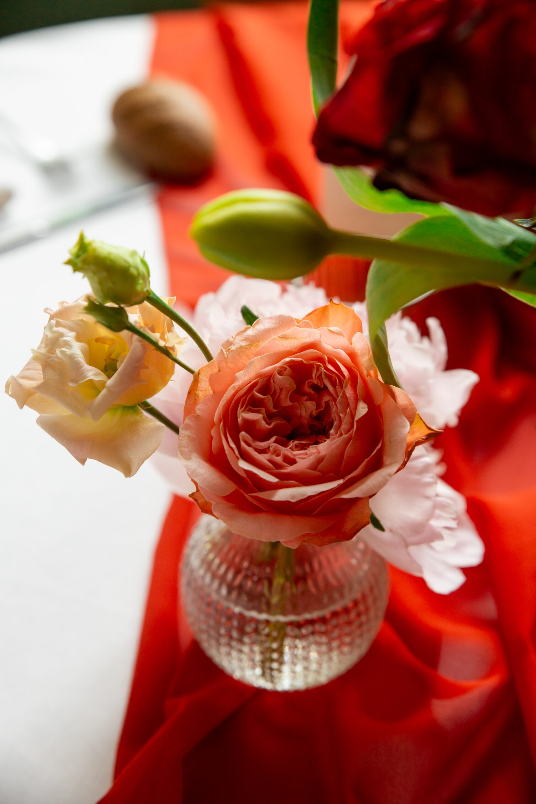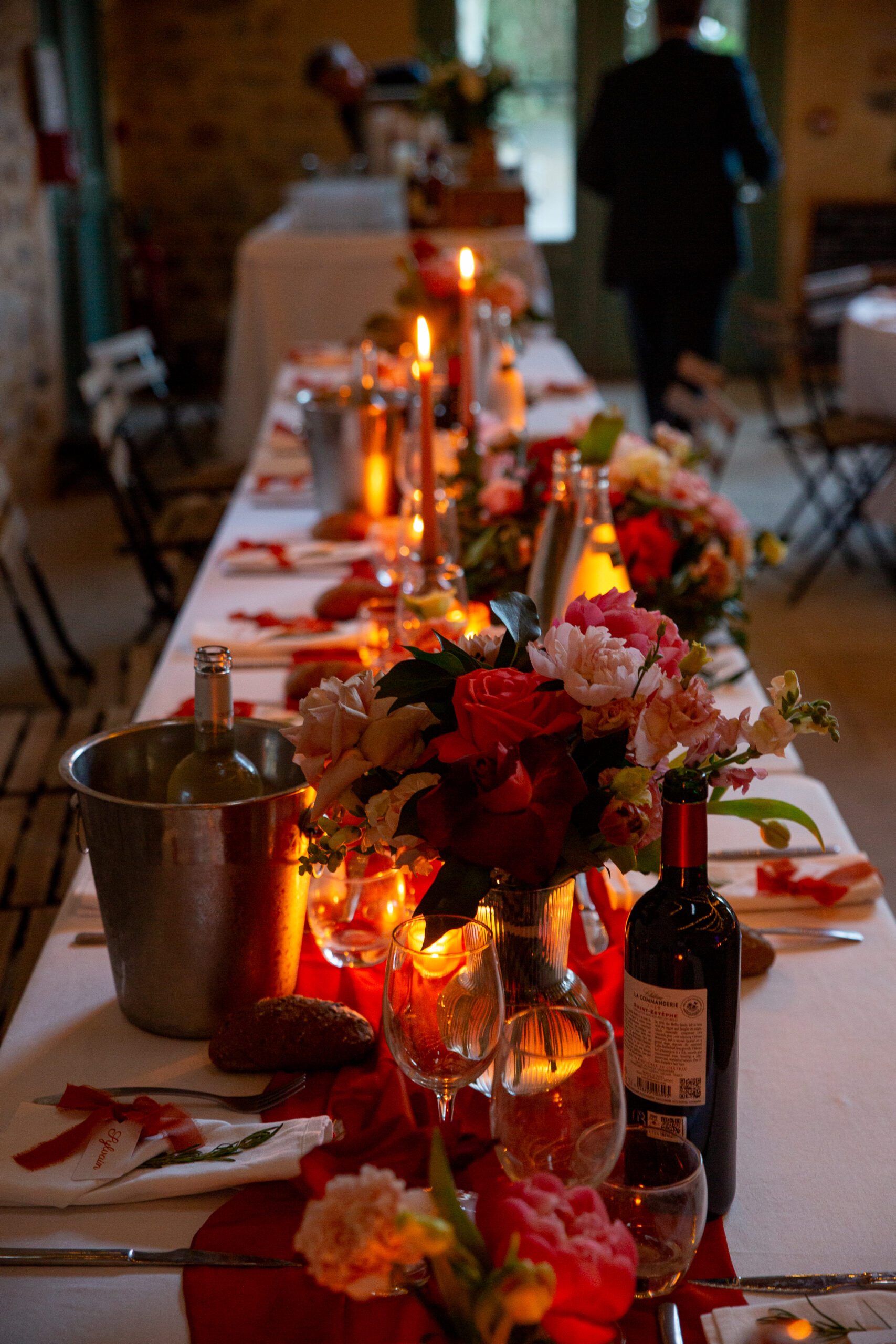 Sur les tables : Des bouquets travaillés en trio avec jeu de volumes et hauteurs, et une composition centrale plus importante pour la table d’honneur qui était allongée.