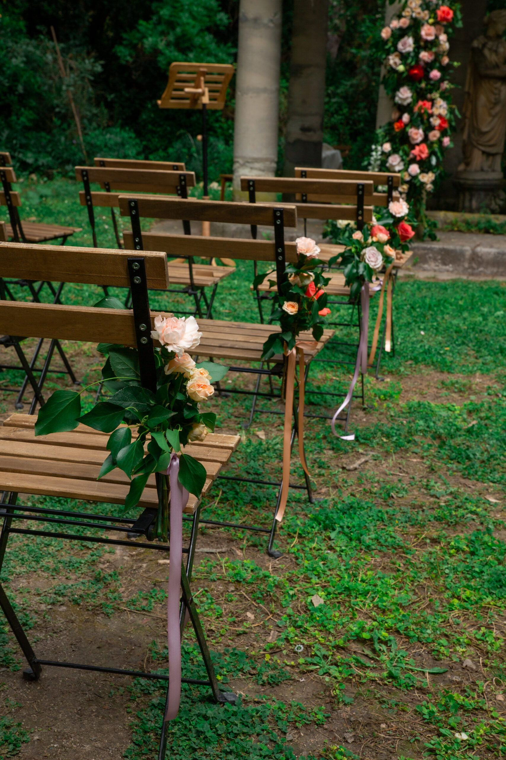 Pour l’allée qui n’est pas très large, nous avons choisi d’installer de simples bouquets attachés avec des rubans colorés.