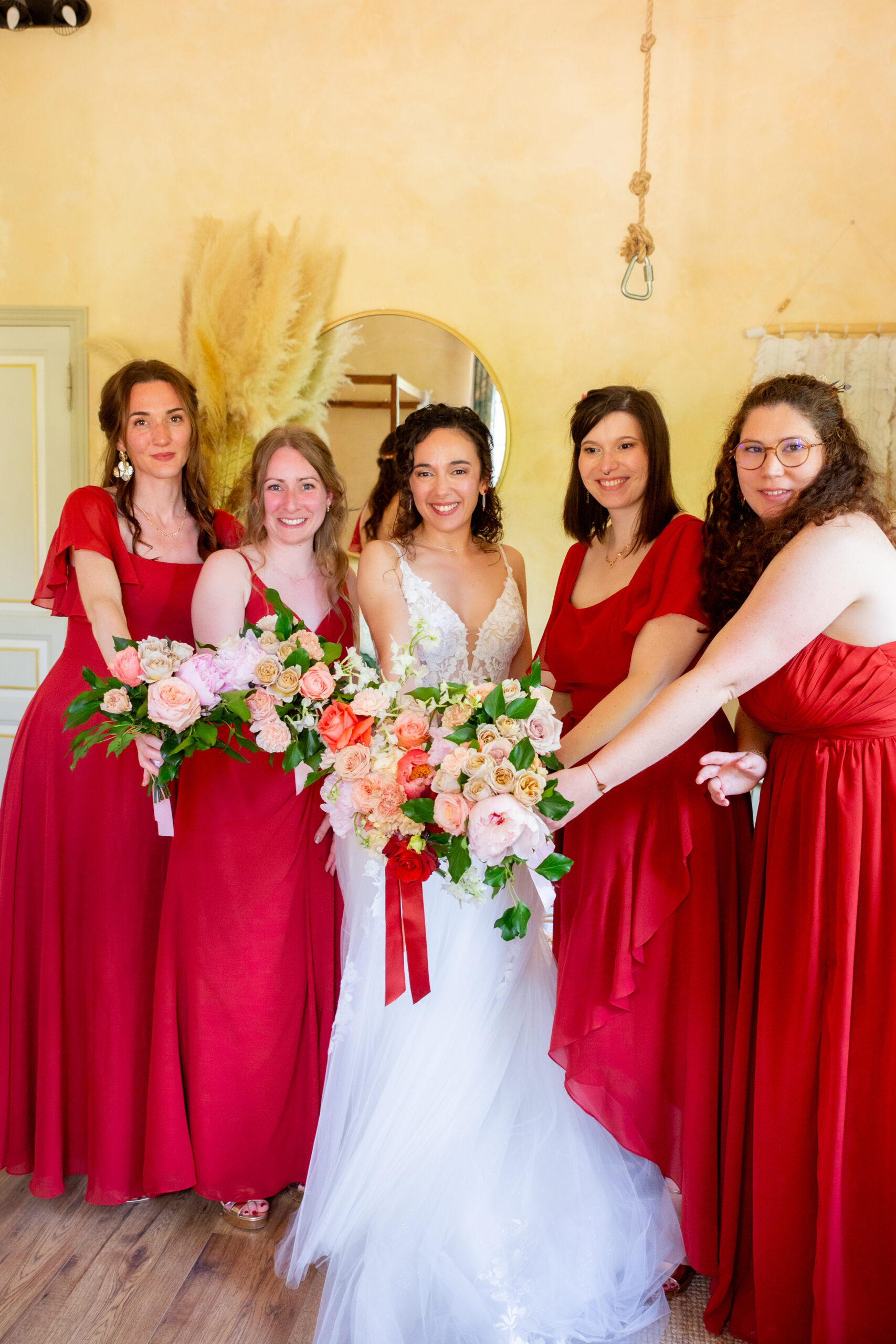Pour le cortège, Ania avait un bouquet déstructuré. Arnaud avait une élégante boutonnière en rappel. Et les demoiselles des petits bouquets assortis.